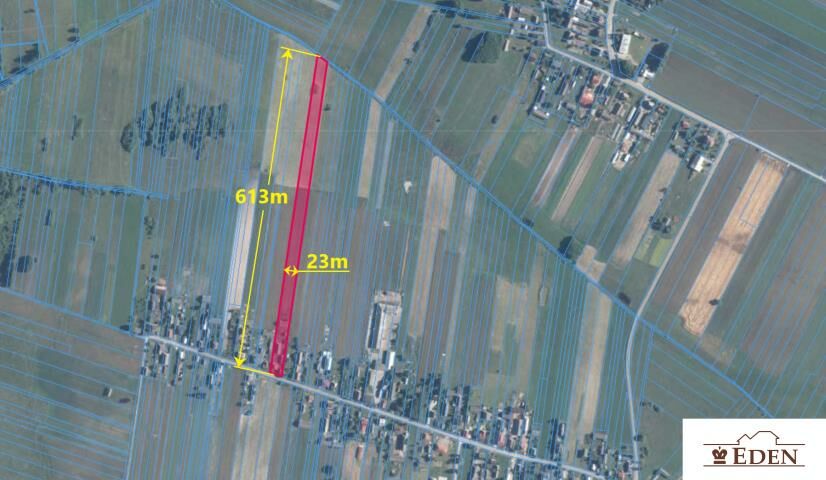 Działka o numerze ewidencyjnym 38 ma kształt wydłużonego prostokąta o wymiarach około 23m X 613xm.