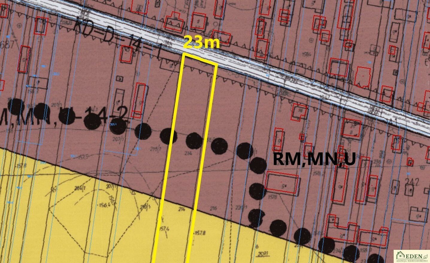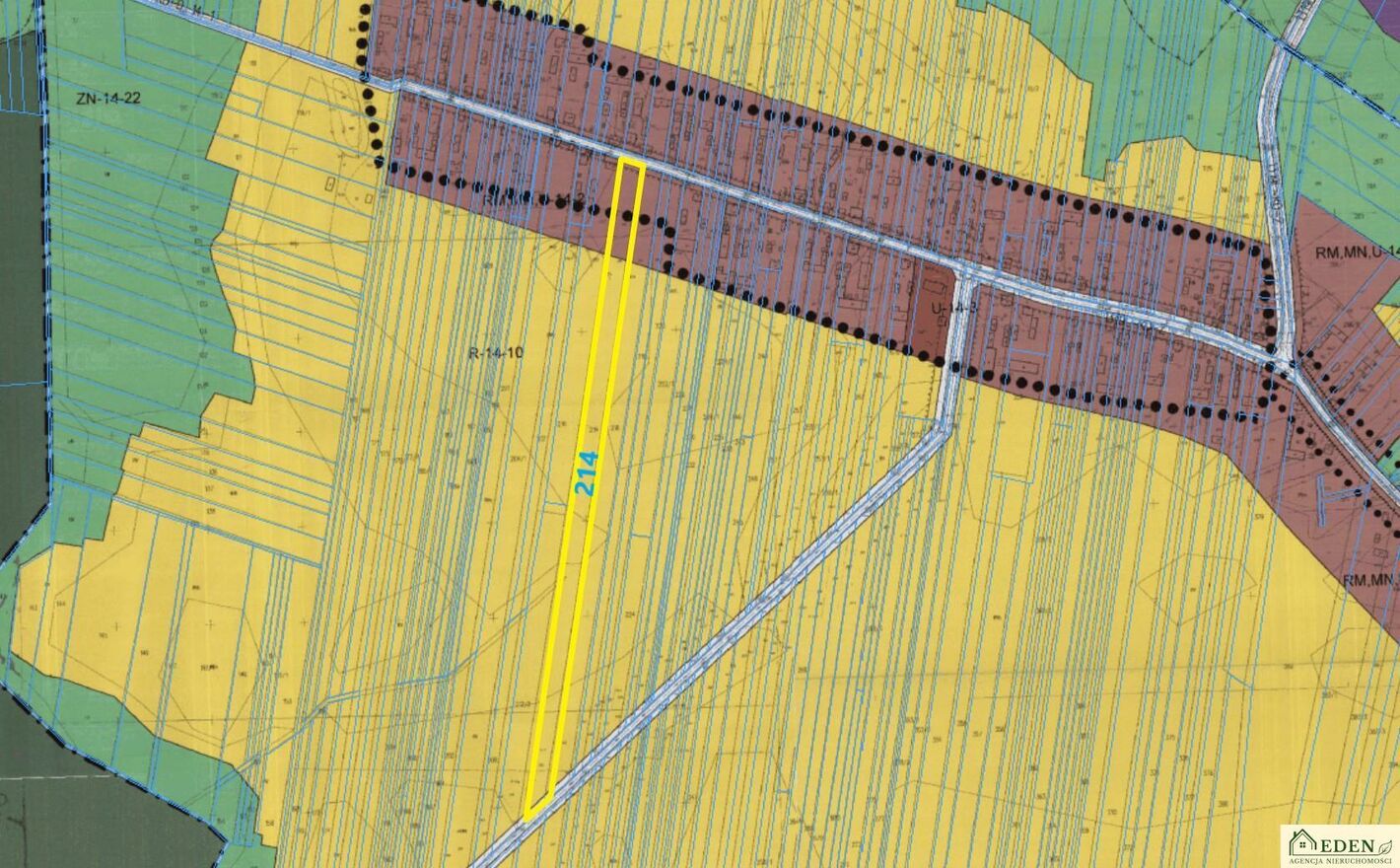 Działka nr 214 o powierzchni 1,55 ha i szerokości ok. 23 m to najbardziej perspektywiczny grunt pod inwestycję mieszkaniowo-usługową. Położona bezpośrednio przy drodze asfaltowej, w której znajdują się media: woda oraz prąd. Około 0,23 ha ma przeznaczenie budowlane (RM, MN, U), dopuszczające zabudowę domów jednorodzinnych, działalności usługowej oraz zabudowę zagrodową. Pozostały obszar to grunty rolne (R). Co istotne, również tylna część działki przylega do asfaltu, co realnie otwiera drogę do przyszłego powiększenia części budowlanej.