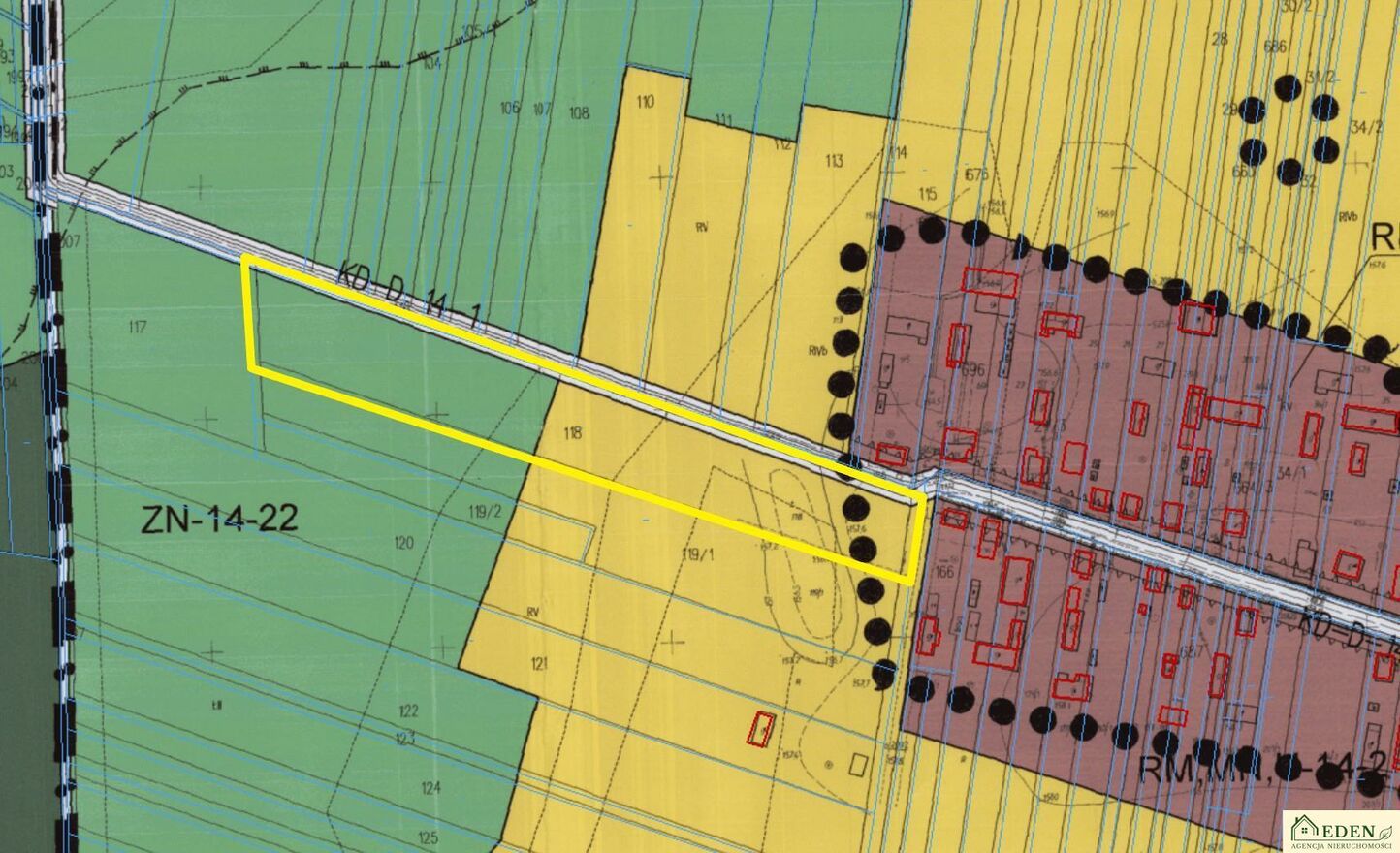 Działka nr 118 o powierzchni 1,07 ha i szerokości ok. 37 m mieści się bezpośrednio przy drodze asfaltowej oraz dodatkowo przy gminnej drodze polnej biegnącej wzdłuż bocznej granicy działki. Zgodnie z obowiązującym planem zagospodarowania, ok. 0,56 ha stanowi teren rolny (R), pozostała część to tereny zielone (ZN) oraz planowana droga gminna przebiegająca wzdłuż najdłuższej granicy działki co daje atrakcyjny potencjał rozwojowy w przyszłości.
